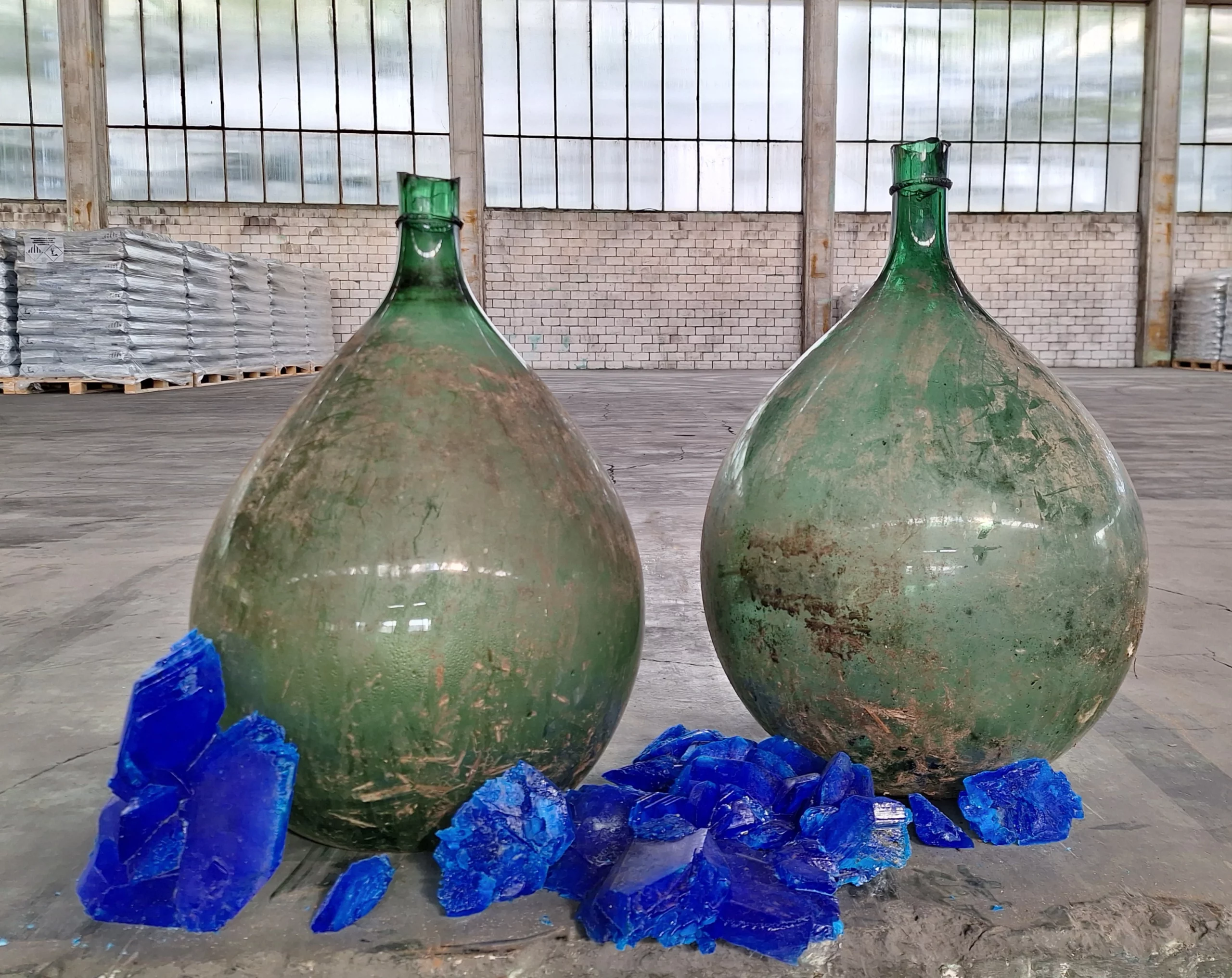 Pierwsza rzemieślnicza produkcja siarczanu miedzi miała bardzo szczególny i wyjątkowy charakter; aby uzyskać pojemniki do produkcji grynszpanu szlachetnego, szklane balony przecinano na pół podpalając sznur nasączony benzyną przymocowany na obwodzie samego balonika.